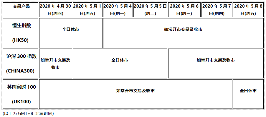 2020430(周四)55(周二)为香港佛诞日假期和国际劳动节假期, 58(周五)为英国银行假期,以下产品的交易时间将于各自市场假期期间全日休市,敬请阁下留意知悉!
