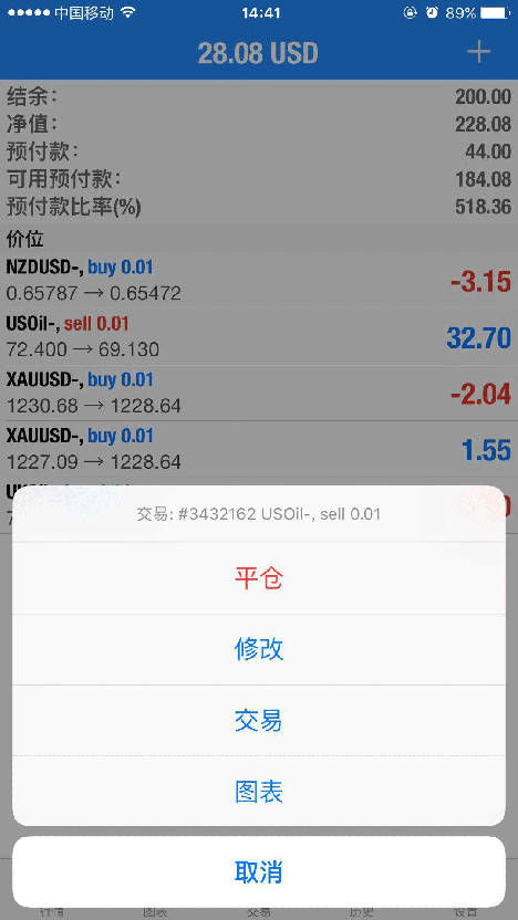 2.在交易页面,长按交易订单,弹出如下窗口。可选择对该订单进行平仓、修改订单、新订单或图表。