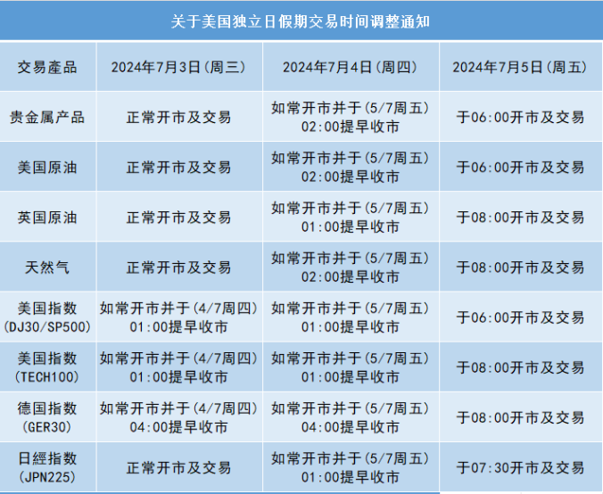 因应2024年7月4日(周四) 为美国市场假期,本公司以下产品的交易时间将于假期期间作以下安排,敬请留意。